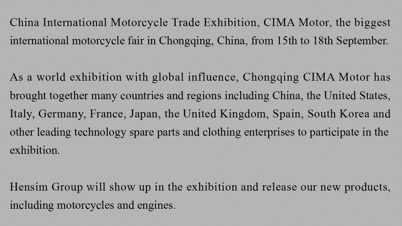 HENSIM GROUP WILL PARTICIPATE THE CIMA MOTOR THIS WEEK, 15-18 SEPTEMBER